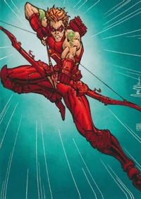 Arsenal is the alter-ego of Roy Harper, who took it after graduating from his role as Green Arrow's side-kick Speedy and dropped it when he became Red Arrow.[1]