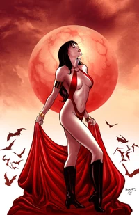 Vampirella is a vampire, since she is the daughter of Lilith and needs blood to survive and has many of the typical vampiric powers, including superhuman physical abilities, shapeshifting into a bat, immortality, and a mesmeric stare. She is not prone to the race's traditional weaknesses, such as daylight, holy water, garlic, or crosses. She does not attack people to drink their blood, except occasionally when she herself is attacked or desires to kill. She is almost always scantily clad in her signature red sling suit with a white collar and wearing shiny black knee-high boots.[1]